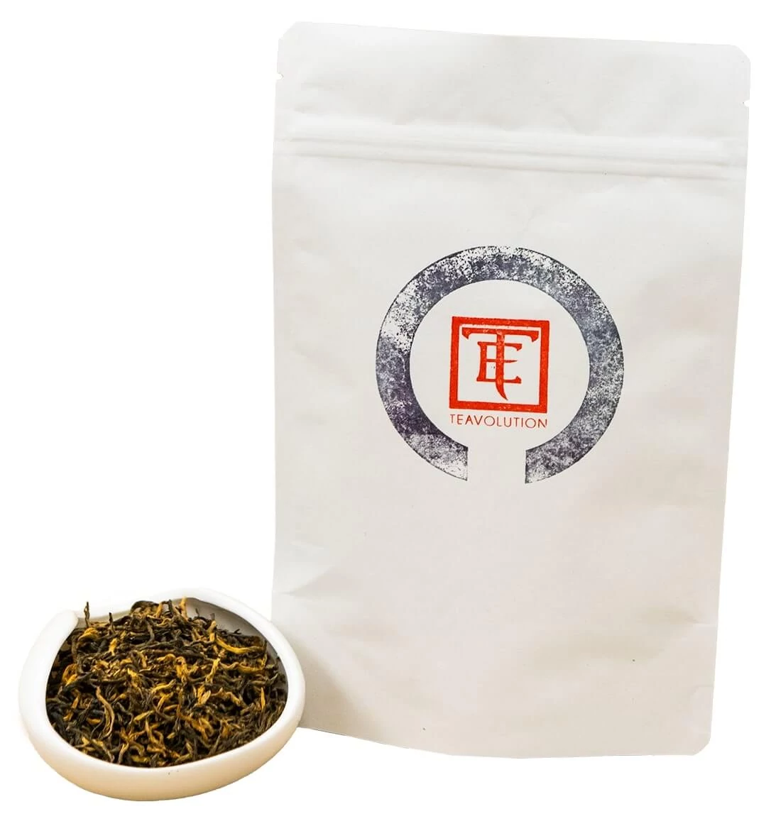 A tealevelek aprók és finomak, arany és barna színekben pompáznak, amelyek a prémium minőséget tükrözik.